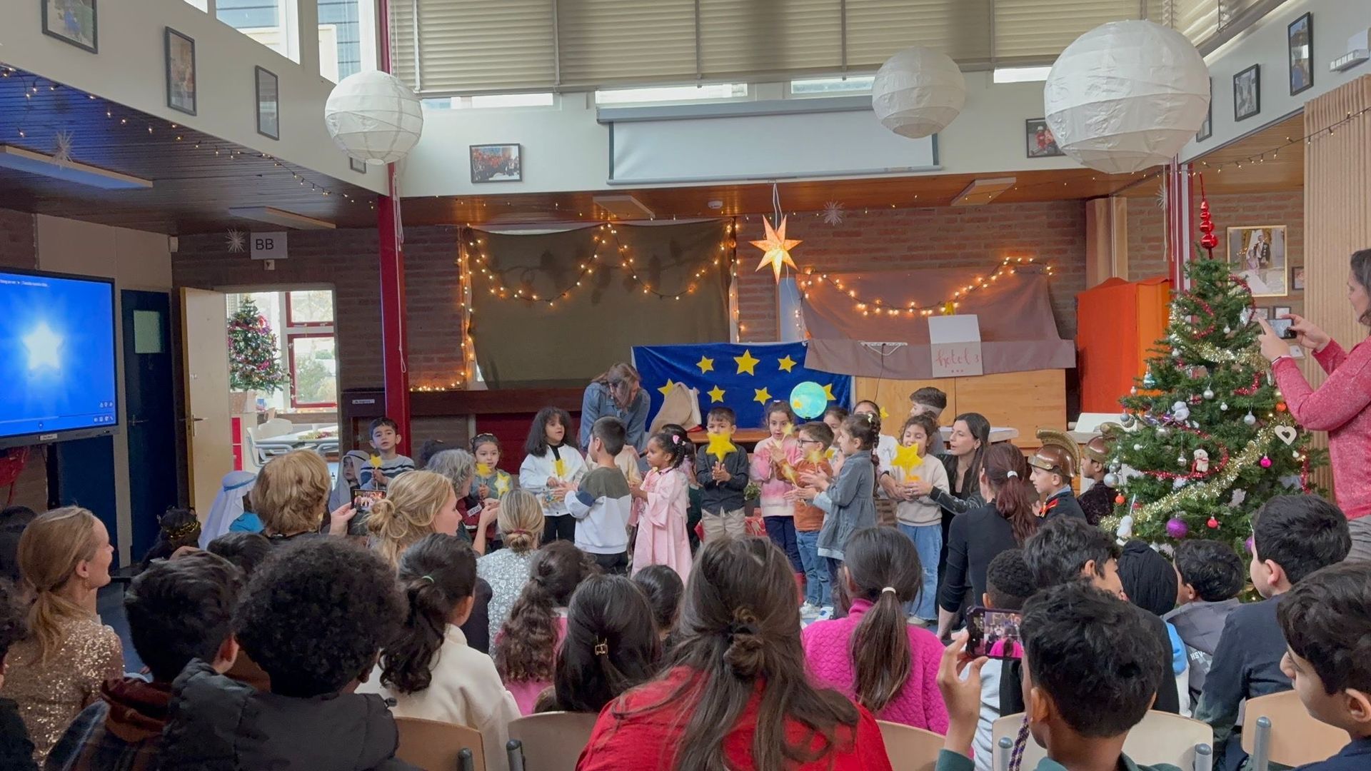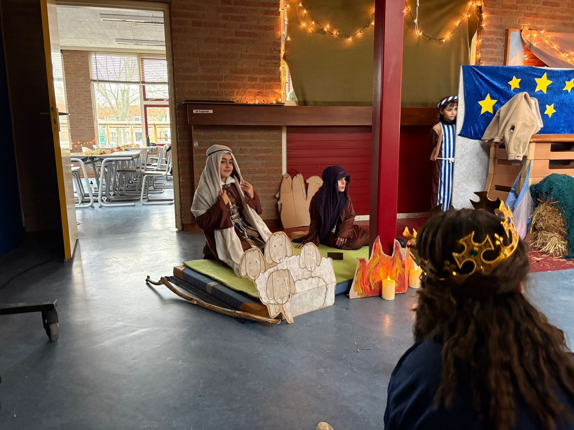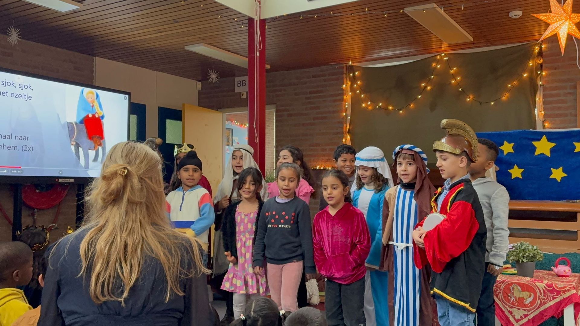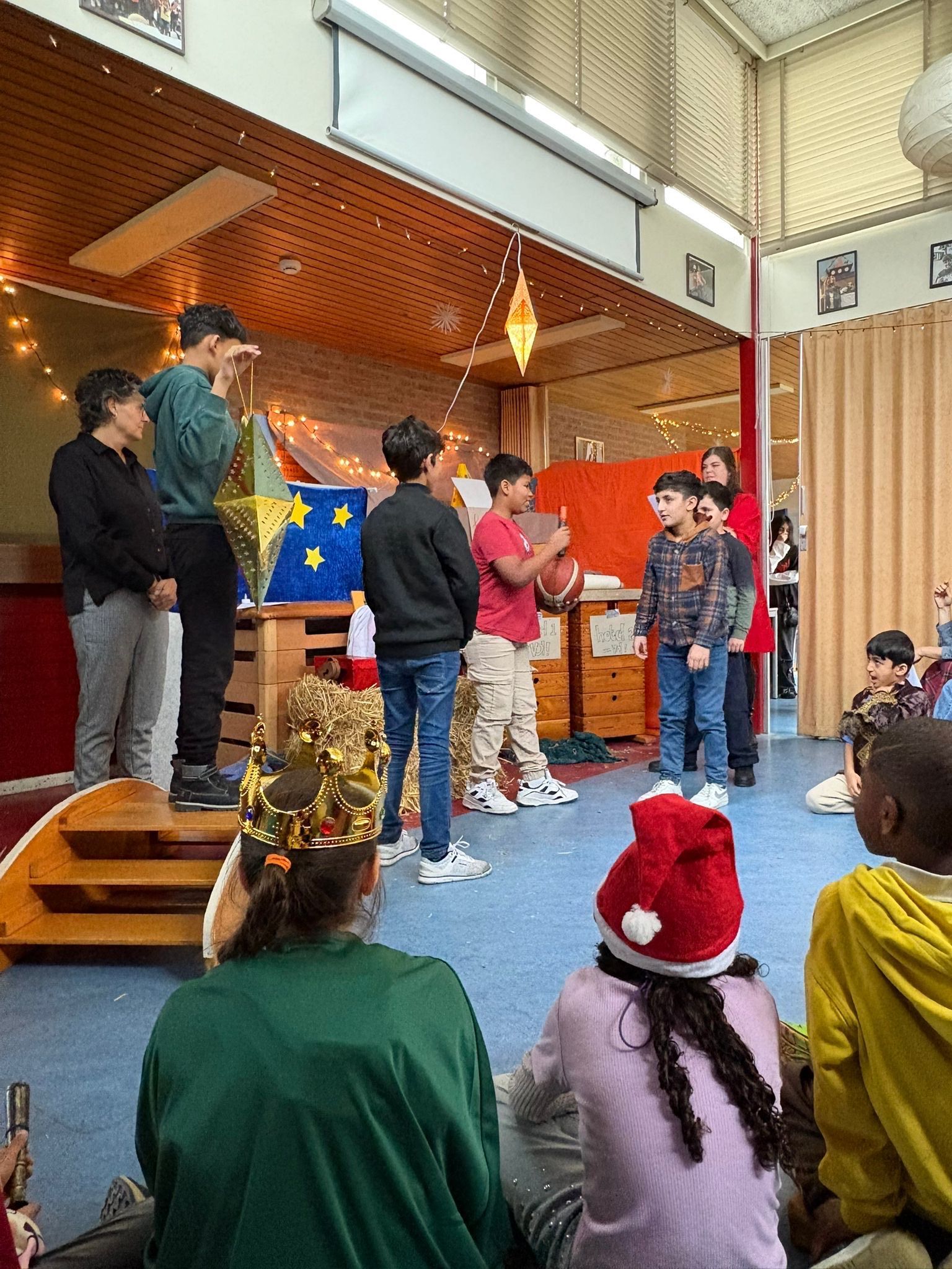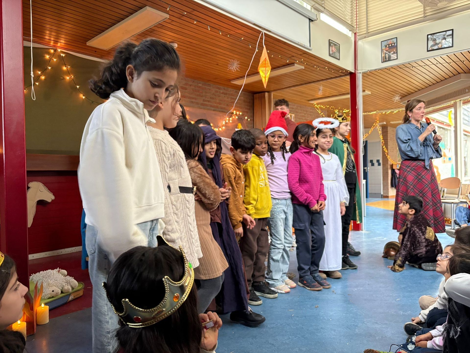 Na het ontbijt kwamen alle groepen samen op de gang voor de kerstviering. Iedere groep liet iets moois zien. Eén groep speelde het kerstverhaal en de leerlingen waren verkleed in prachtige kostuums. Andere groepen zongen een kerstlied of speelden een klein toneelstukje. Het was bijzonder om te zien hoe iedereen straalde en hoe het licht van de leerlingen door de hele school ging.