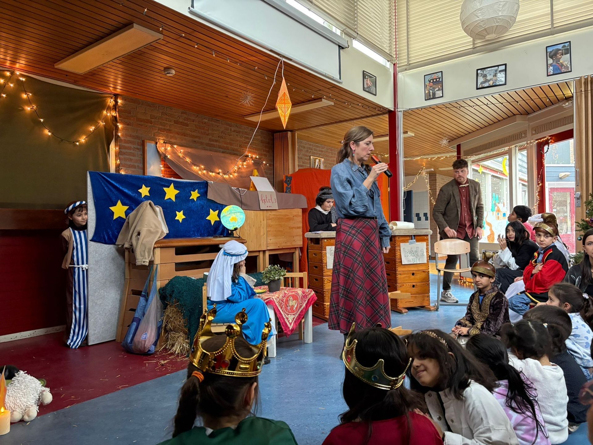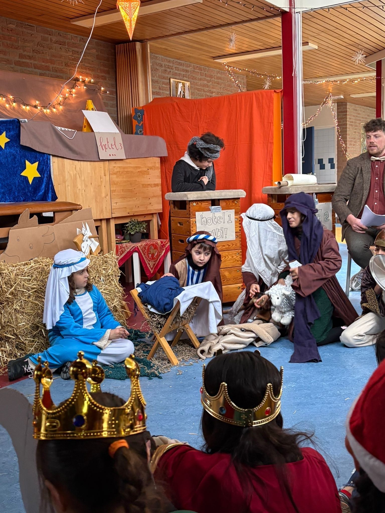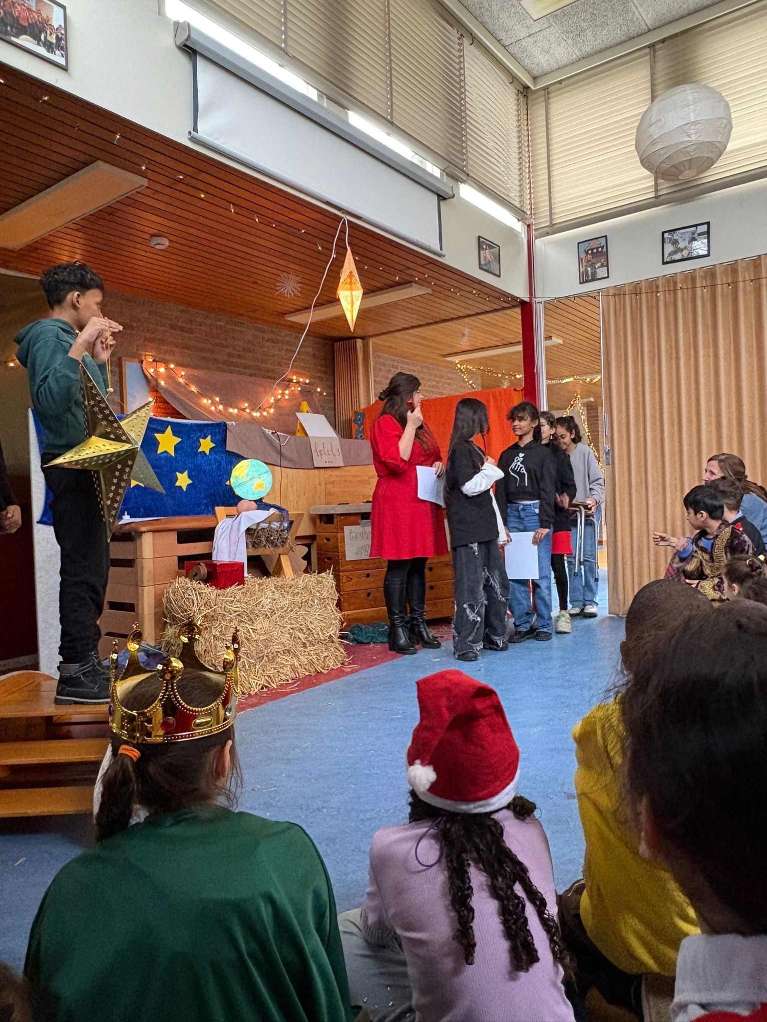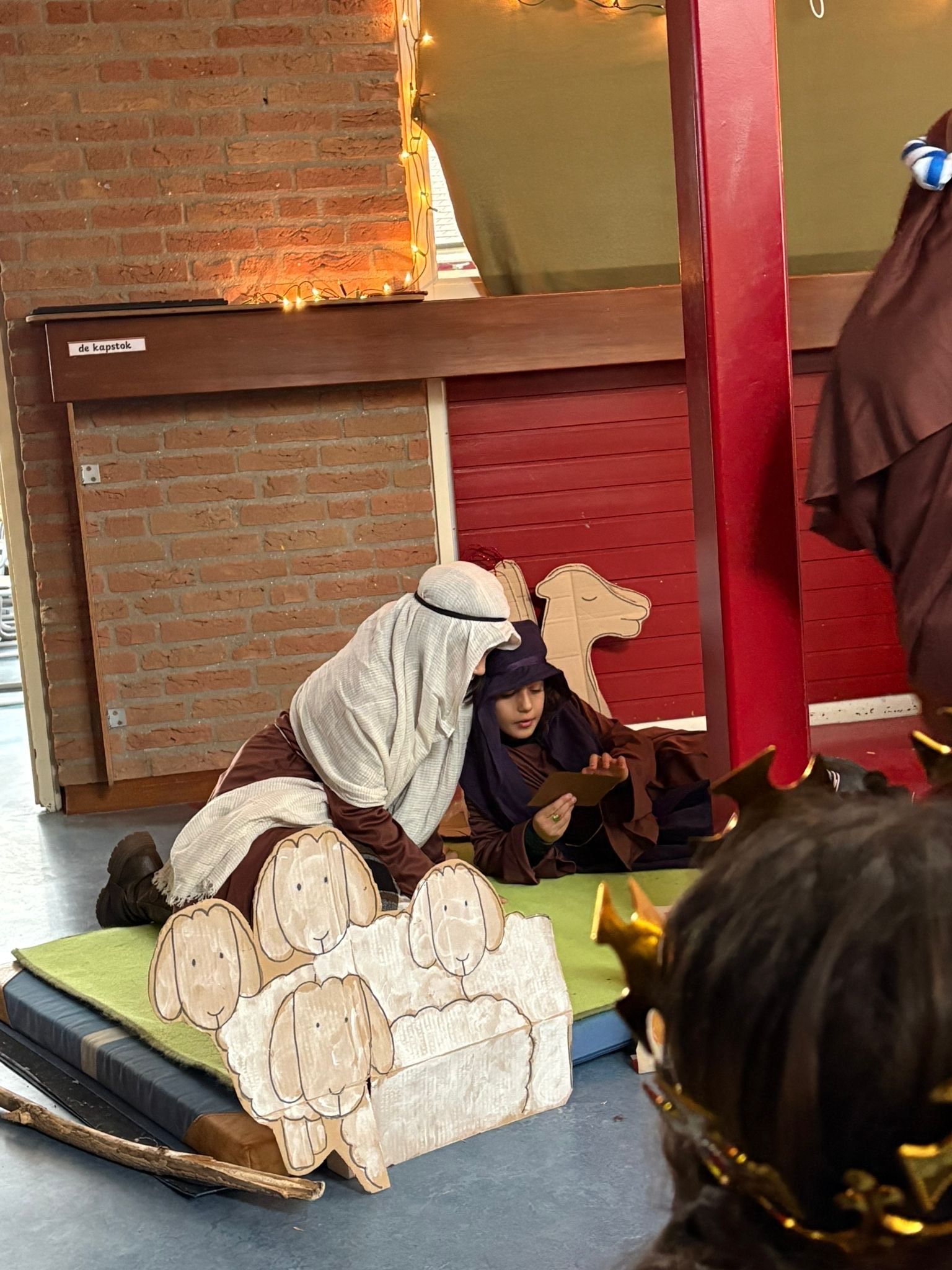 Na het ontbijt kwamen alle groepen samen op de gang voor de kerstviering. Iedere groep liet iets moois zien. Eén groep speelde het kerstverhaal en de leerlingen waren verkleed in prachtige kostuums. Andere groepen zongen een kerstlied of speelden een klein toneelstukje. Het was bijzonder om te zien hoe iedereen straalde en hoe het licht van de leerlingen door de hele school ging.
