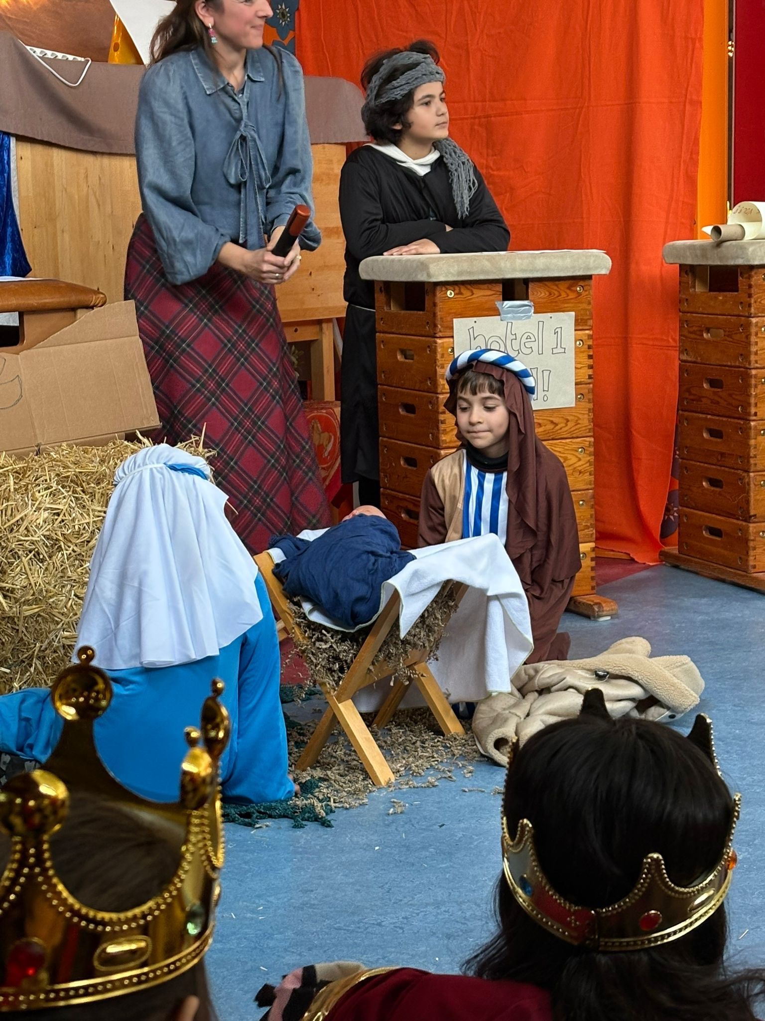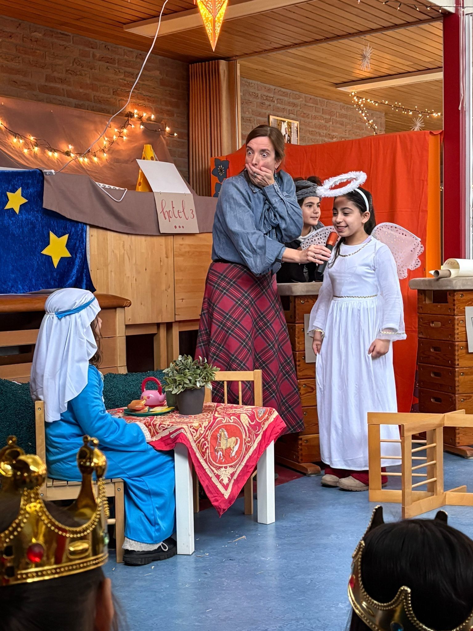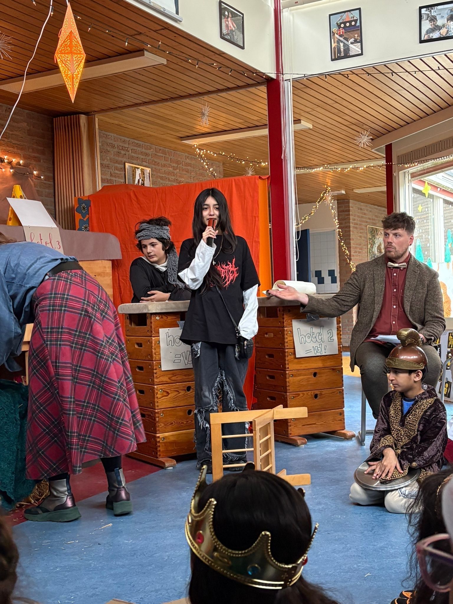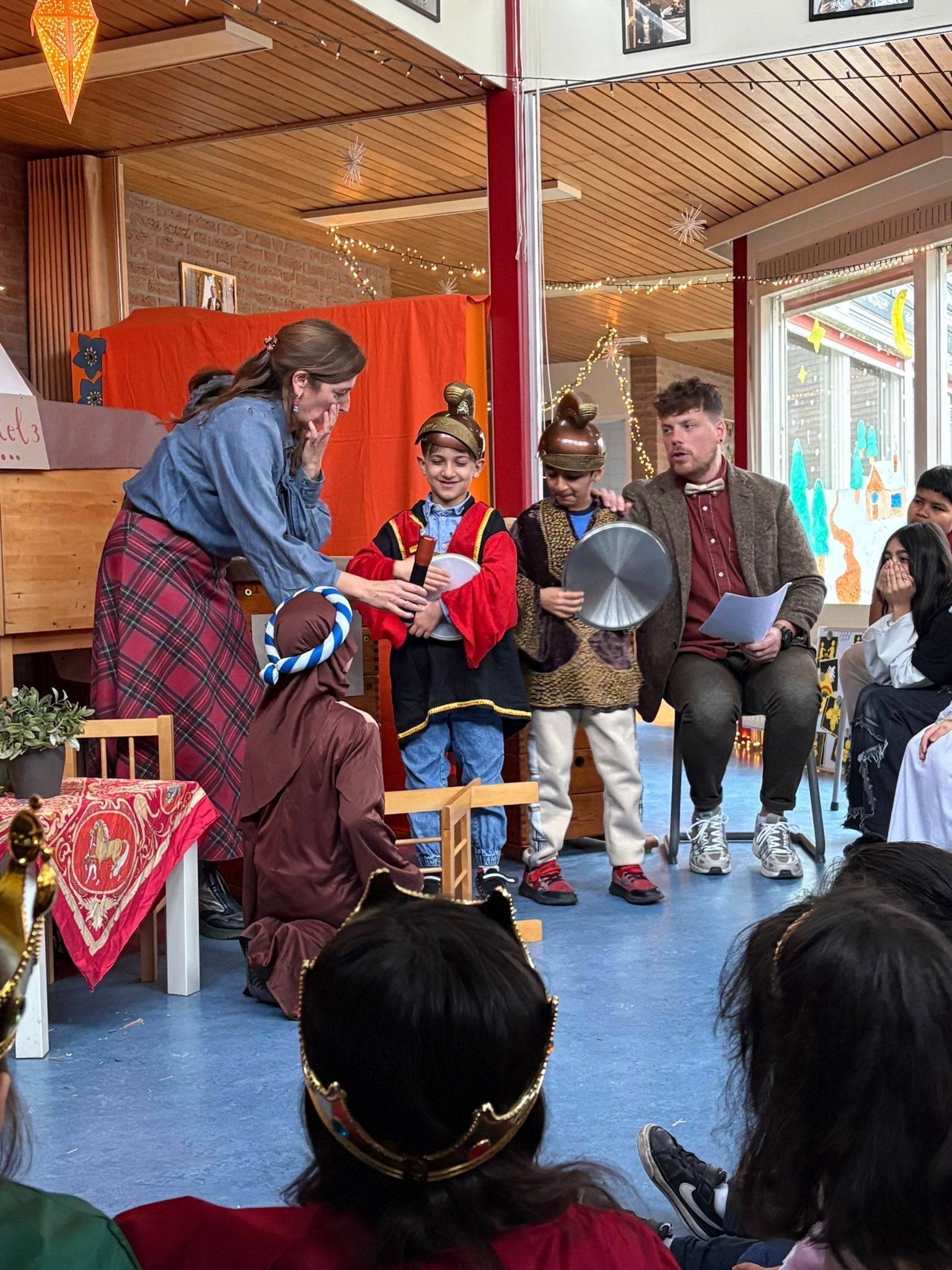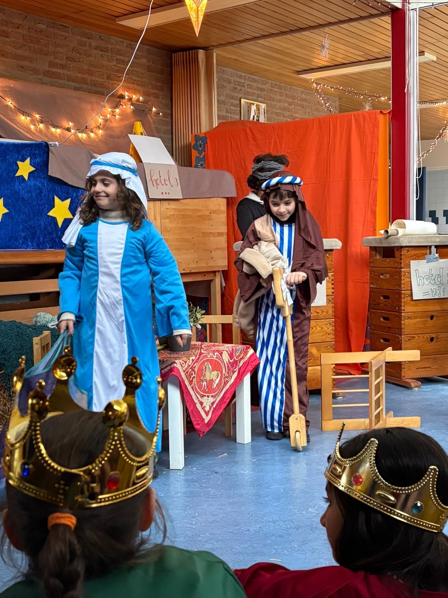 Na het ontbijt kwamen alle groepen samen op de gang voor de kerstviering. Iedere groep liet iets moois zien. Eén groep speelde het kerstverhaal en de leerlingen waren verkleed in prachtige kostuums. Andere groepen zongen een kerstlied of speelden een klein toneelstukje. Het was bijzonder om te zien hoe iedereen straalde en hoe het licht van de leerlingen door de hele school ging.