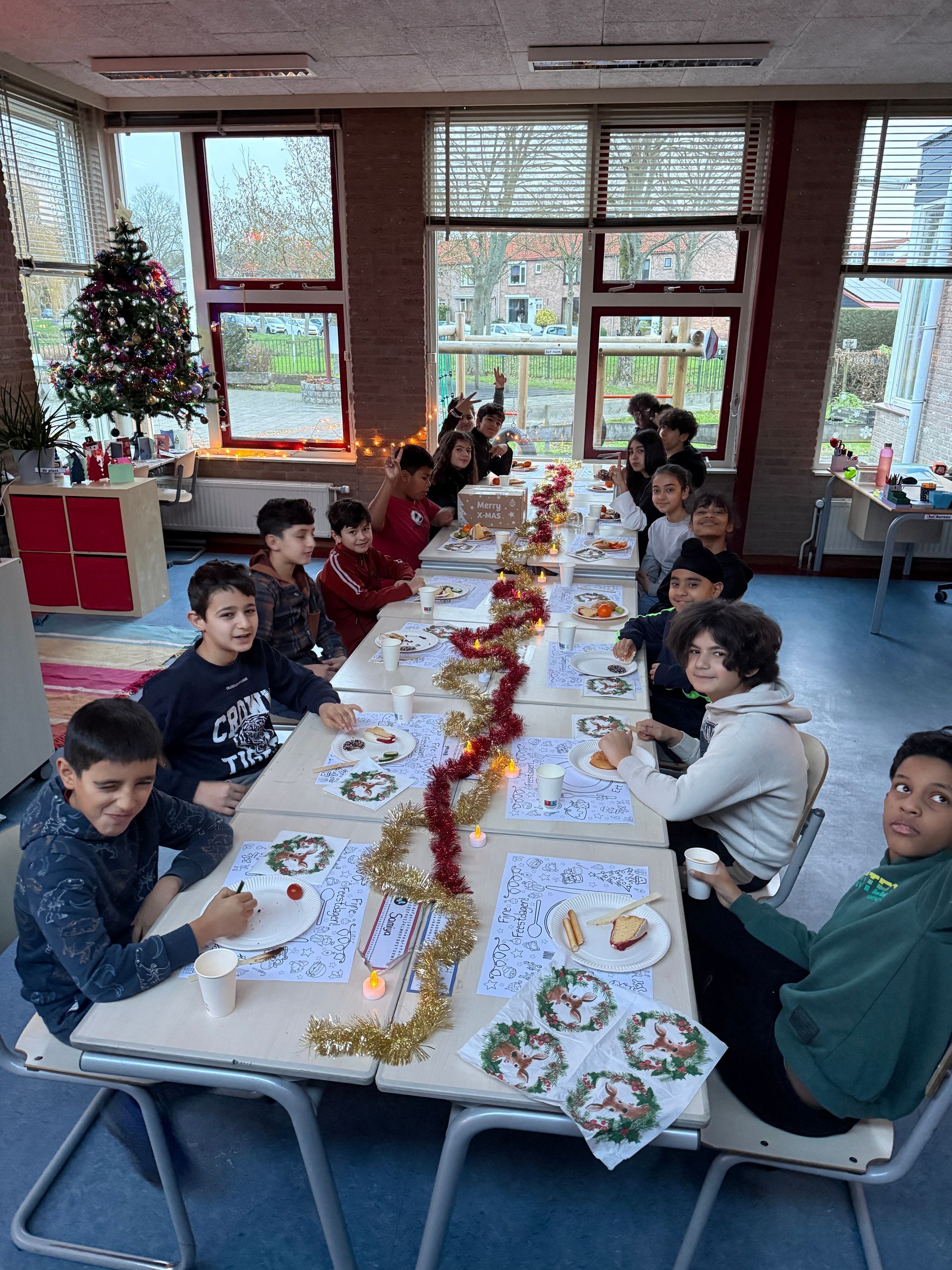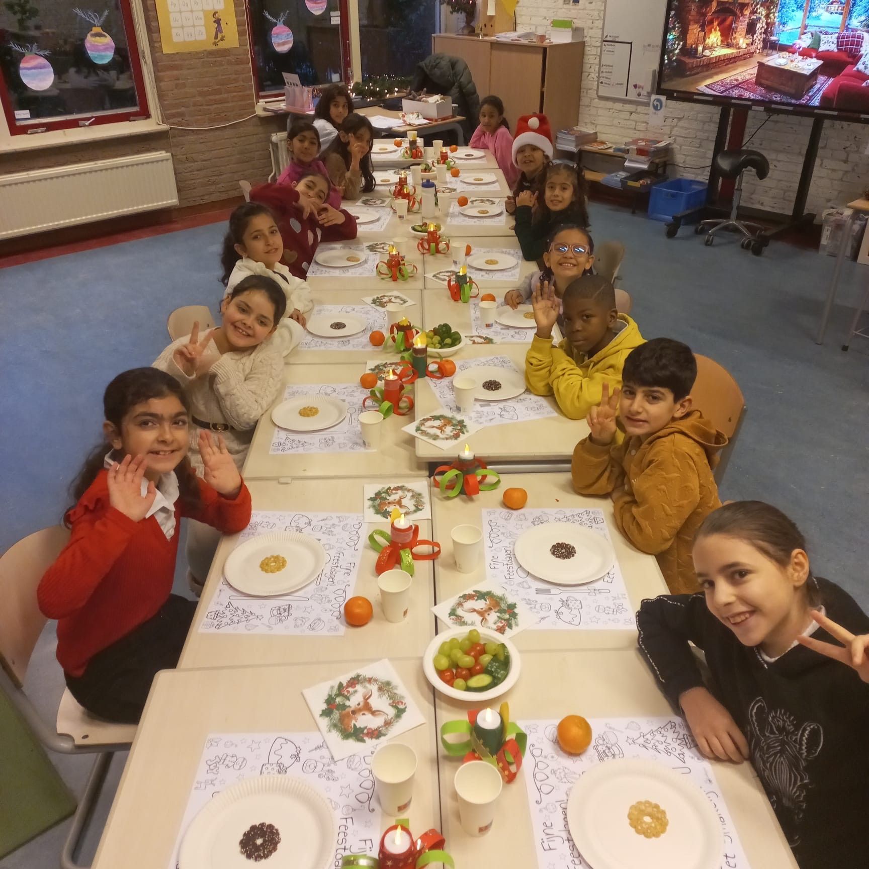 Op donderdag 18 december was het kerstfeest op school. De school was die dag extra verlicht met mooie lampjes. We begonnen de ochtend met een fijn kerstontbijt in de klas. Samen aan tafel, met lekkere hapjes en gezelligheid. Daarna deden we kerstspelletjes met elkaar.