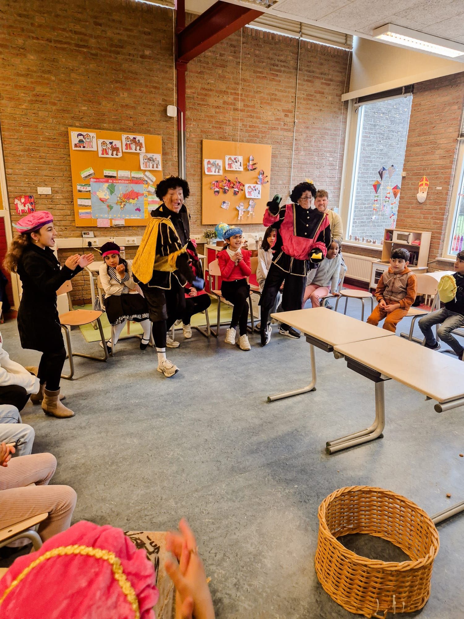 In the morning, Sinterklaas arrived at the school playground. All the children were already waiting and were happy to see him. We sang Sinterklaas songs together and danced to the music. What a cheerful start to the day!